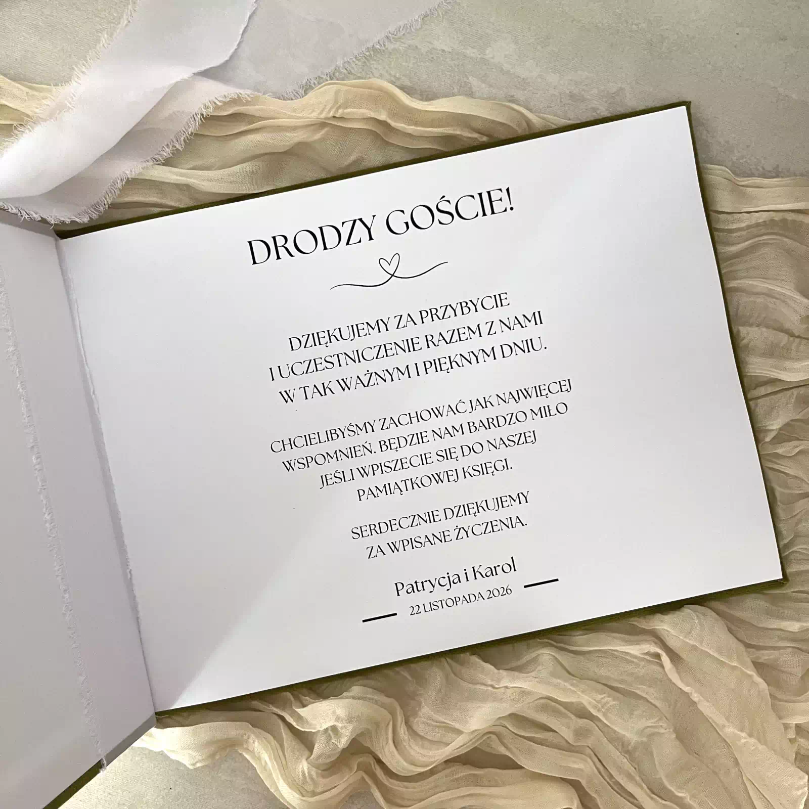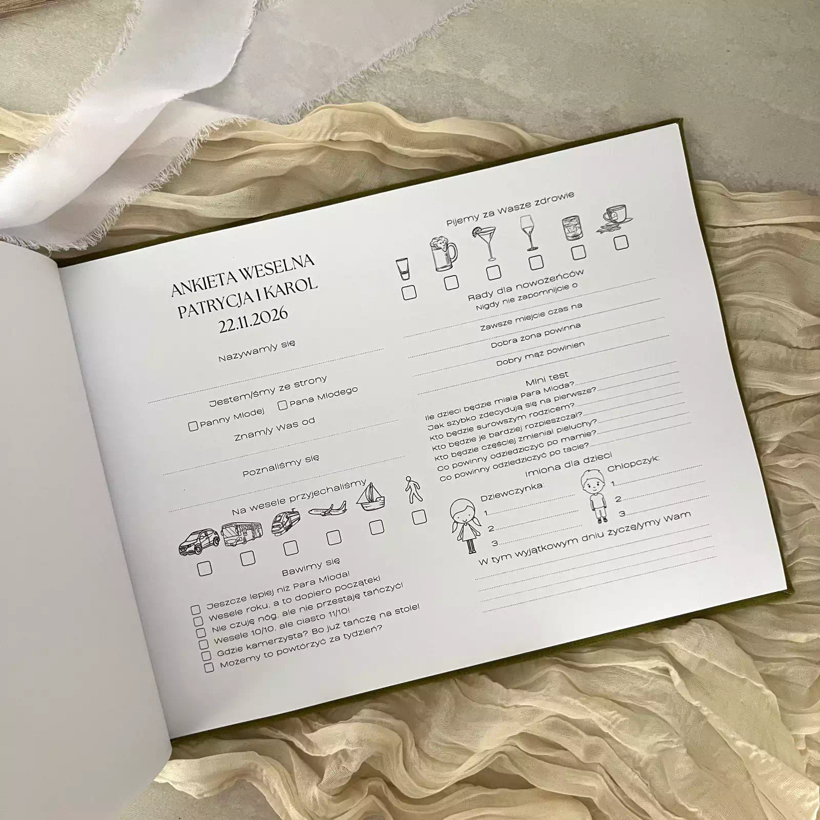 Personalizowana Księga gości z ankietą weselną welurowa to wyjątkowa propozycja dla Par Młodych, które pragną połączyć elegancję z funkcjonalnością. Ręcznie wykonana, z najwyższą dbałością o każdy detal, stanowi nie tylko piękną dekorację stołu weselnego, ale także niezastąpioną pamiątkę, do której wraca się z radością przez lata. Księga gości na wesele pozwala gościom pozostawić życzenia, wspomnienia oraz zabawne wpisy w sposób trwały i elegancki, dzięki czemu dzień ślubu pozostaje w pamięci w najpiękniejszej formie.