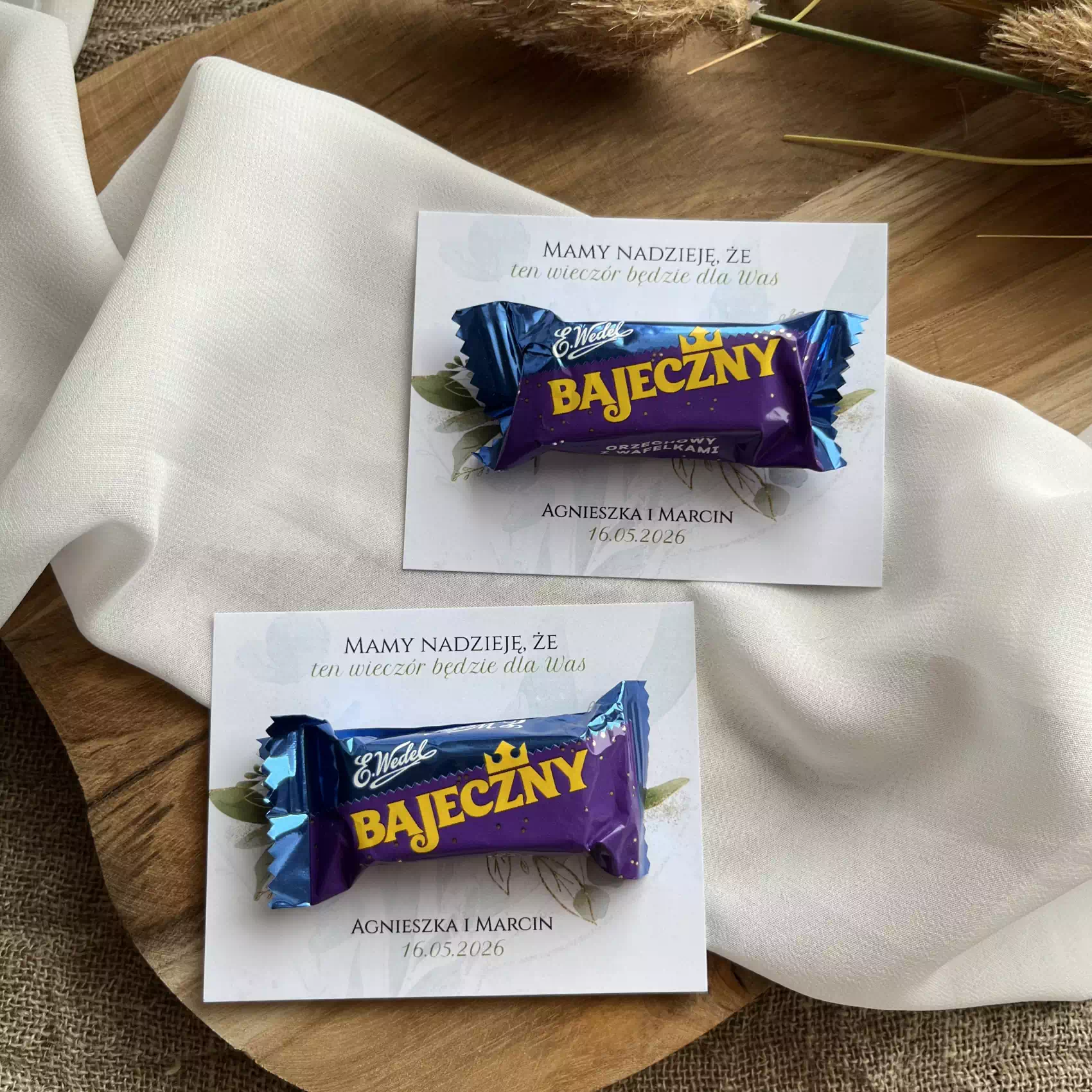 Mini podziękowania dla gości Bajeczny Eucalyptus to wyjątkowy sposób, by w elegancki i oryginalny sposób podziękować bliskim za obecność w dniu ślubu. Delikatny motyw Eucalyptus w połączeniu z subtelnym designem tworzy harmonijną całość. Pięknie komponują się z dekoracjami stołów w stylu boho, rustykalnym i nowoczesnym. Papierowa podkładka z napisem „Mamy nadzieję, że ten wieczór będzie dla Was” wraz z czekoladką Bajeczny to drobny, ale znaczący gest, który zostaje w pamięci gości.
