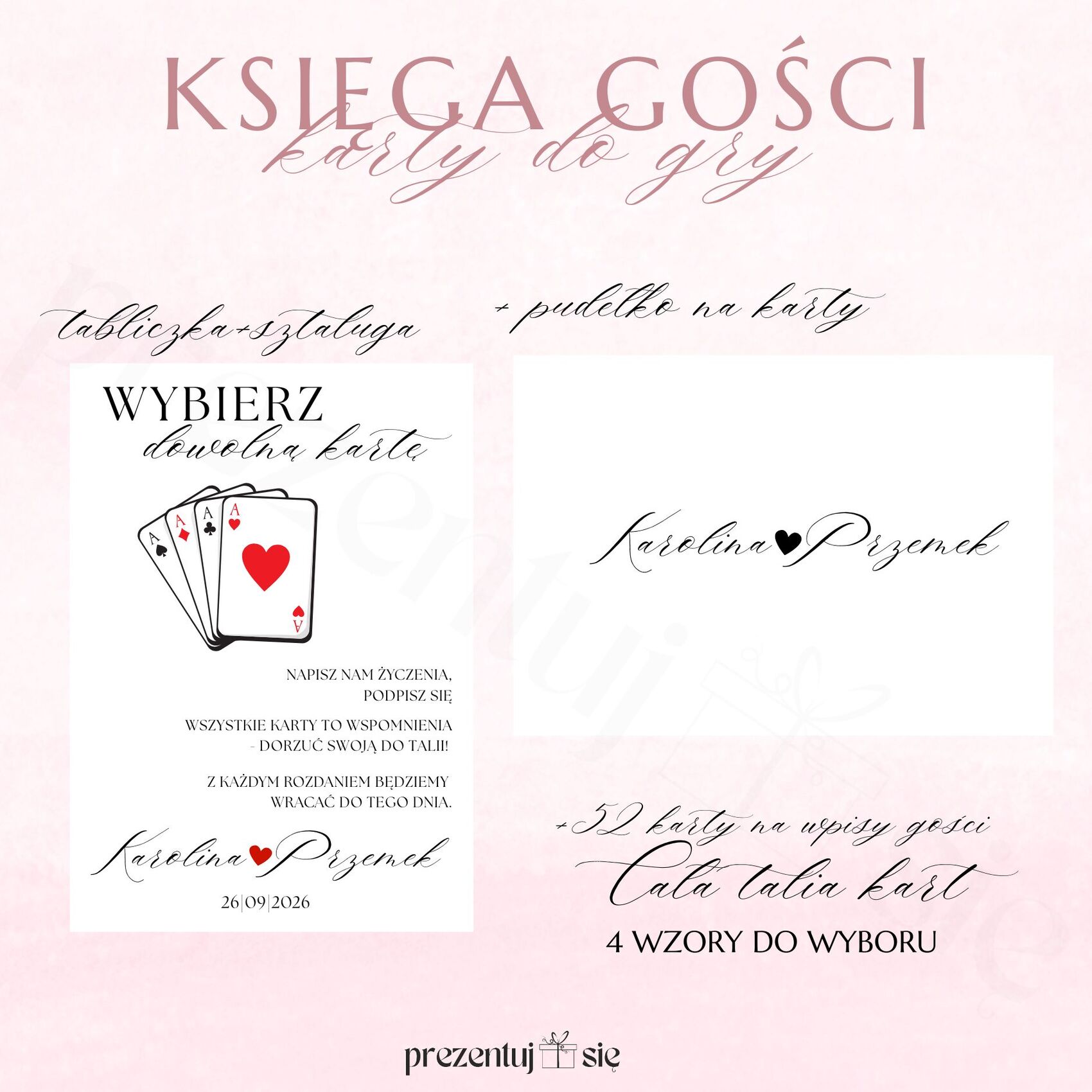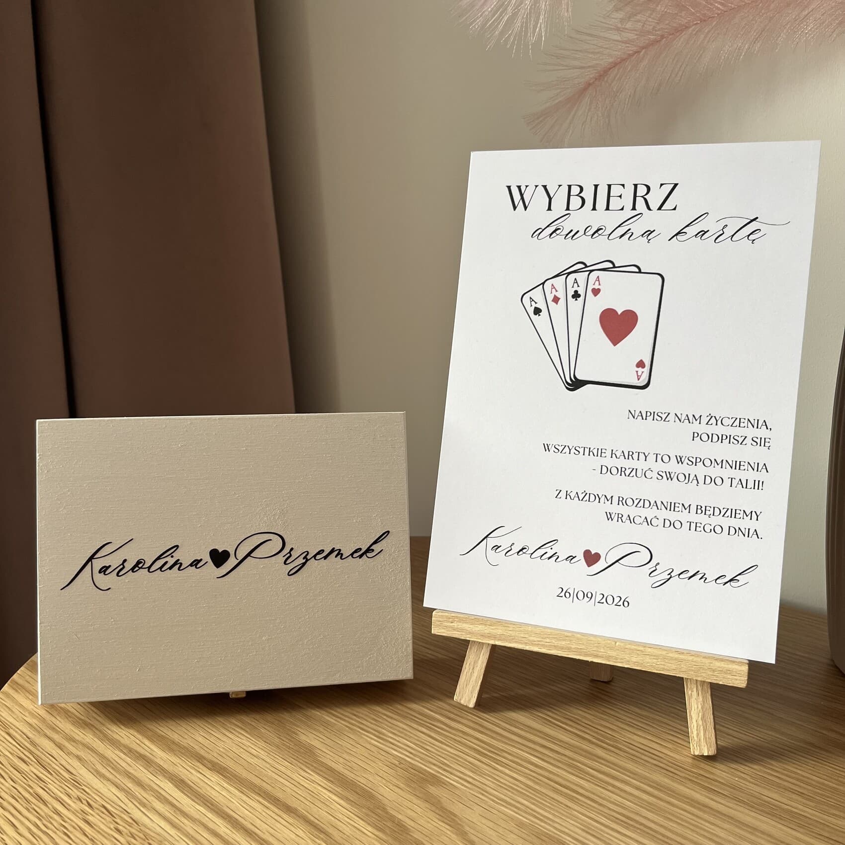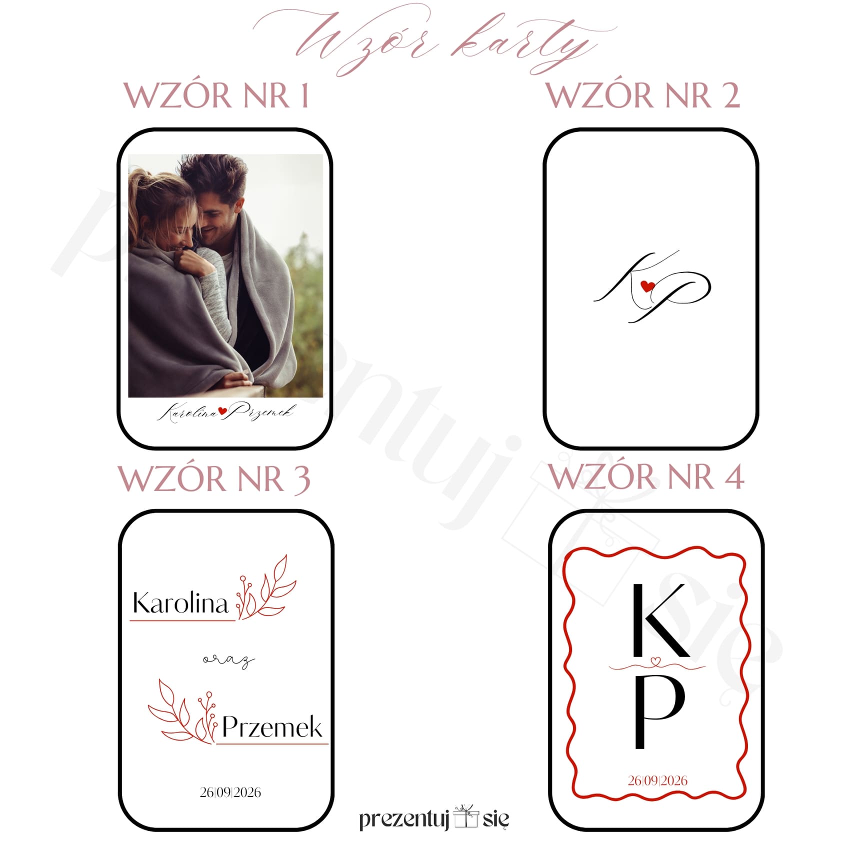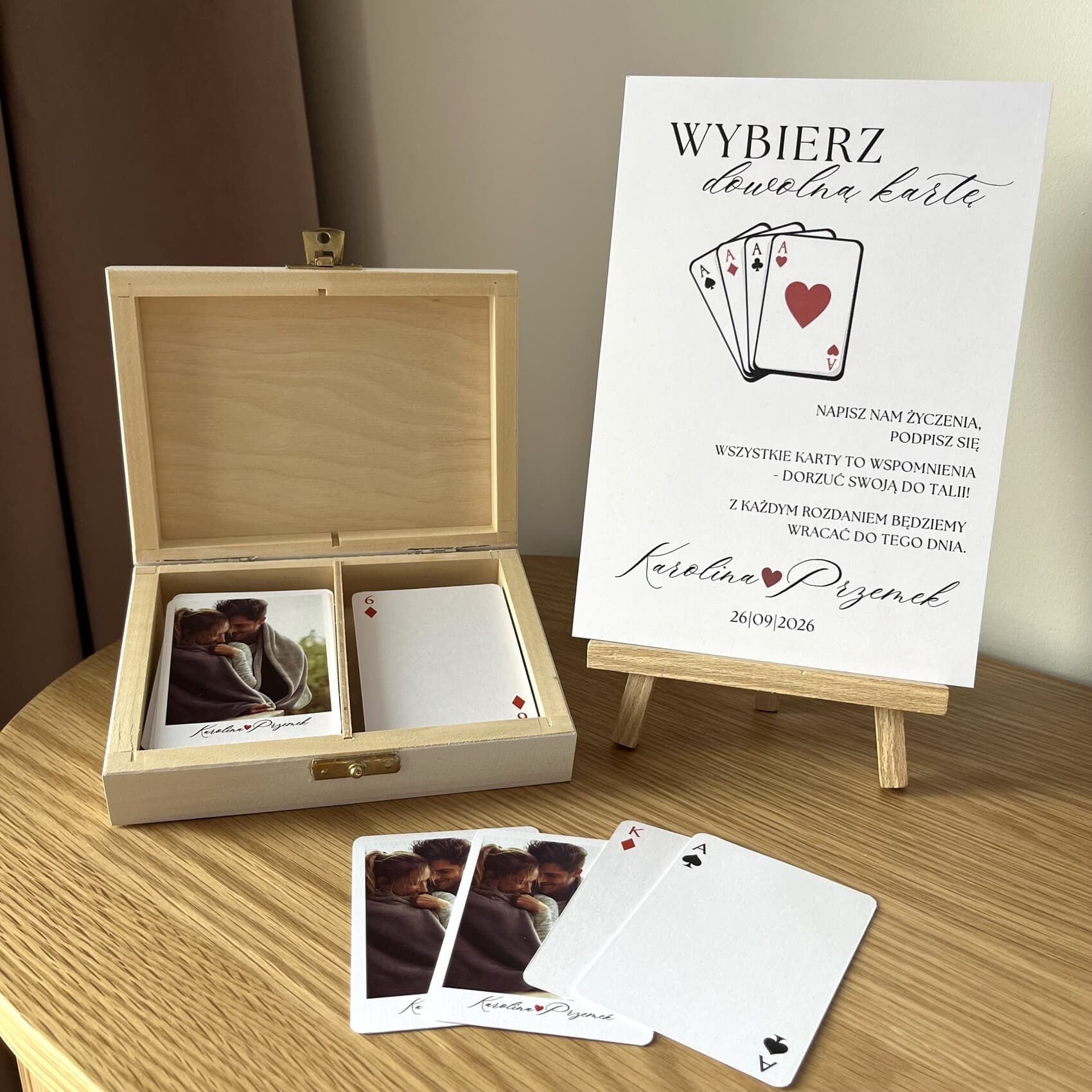 Nietypowa księga gości to innowacyjne rozwiązanie dla Par Młodych, które szukają oryginalnej alternatywy dla tradycyjnych ksiąg gości weselnych. Produkt łączy w sobie elegancję, kreatywność i dodatkowo personalizację. Zamiast standardowych wpisów w księdze, goście otrzymują talię kart do gry, na której mają możliwość pozostawienia życzeń i wspomnień. Każda karta może być spersonalizowana – na odwrocie znajduje się zdjęcie, imiona lub inicjały Pary Młodej, a druga strona oferuje miejsce na wpisy oraz figury z talii.