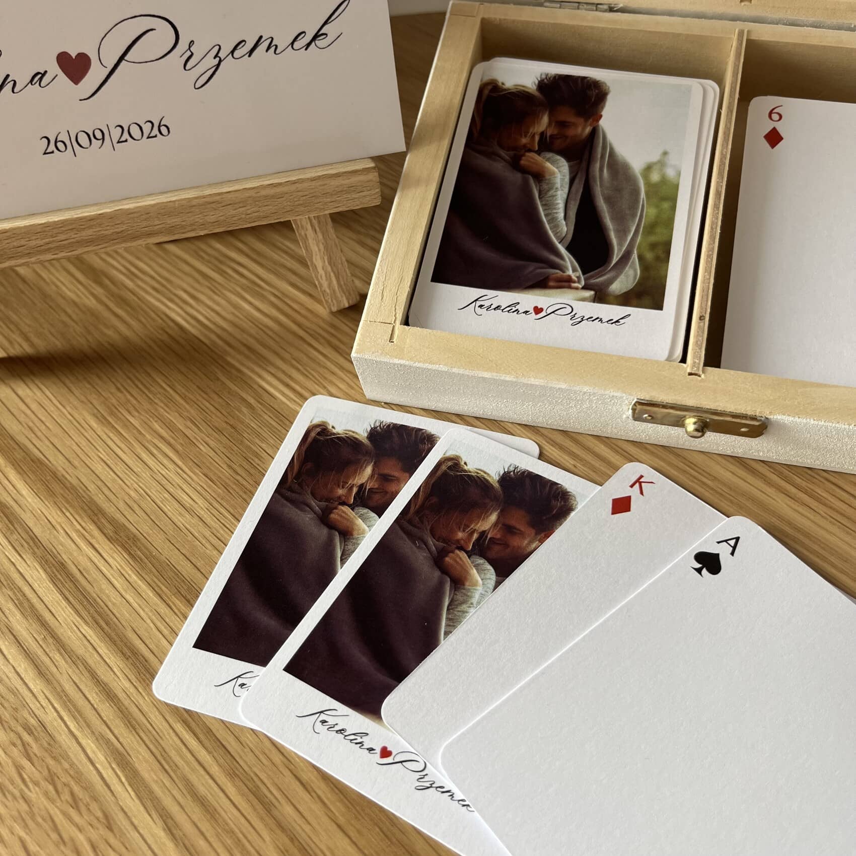 - talia 52 personalizowanych kart ( standardowa talia kart do gry z jednej ze stron karty, a z drugiej dowolna personalizacja spośród 4 wzorów )