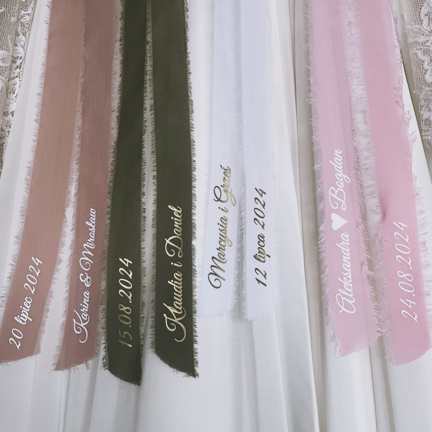 W zależności jak wpiszesz Wasze imiona oraz datę tak będą one umieszczona na wstążce. Możesz wpisać np. „Ola & Tomasz”, „Ola i Tomasz”, „Ola ♥ Tomasz”, a także „12 lipca 2025” lub „12.07.2025”