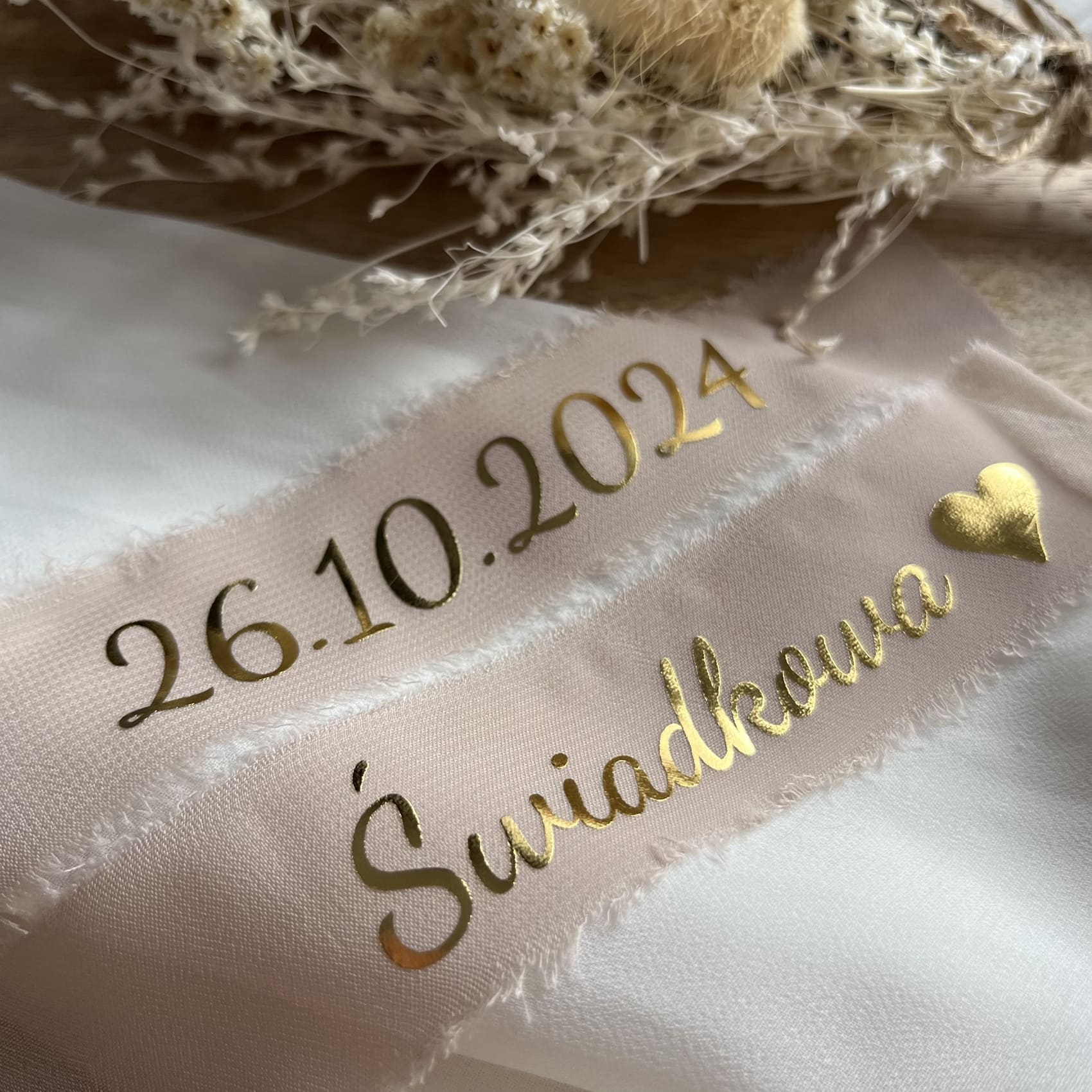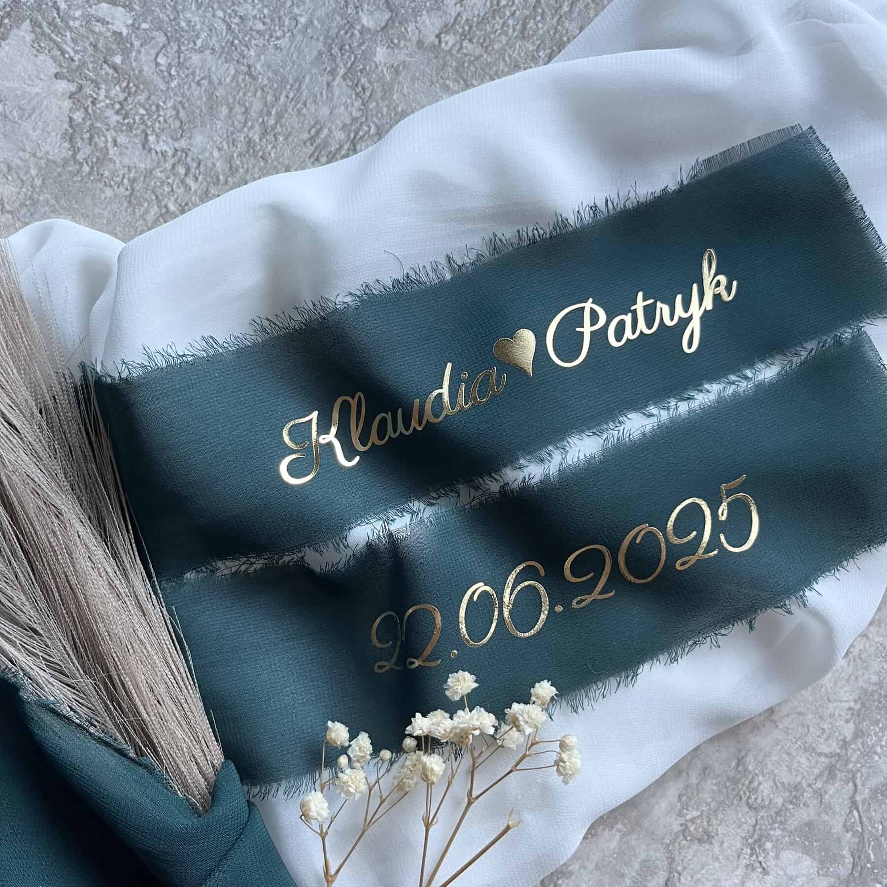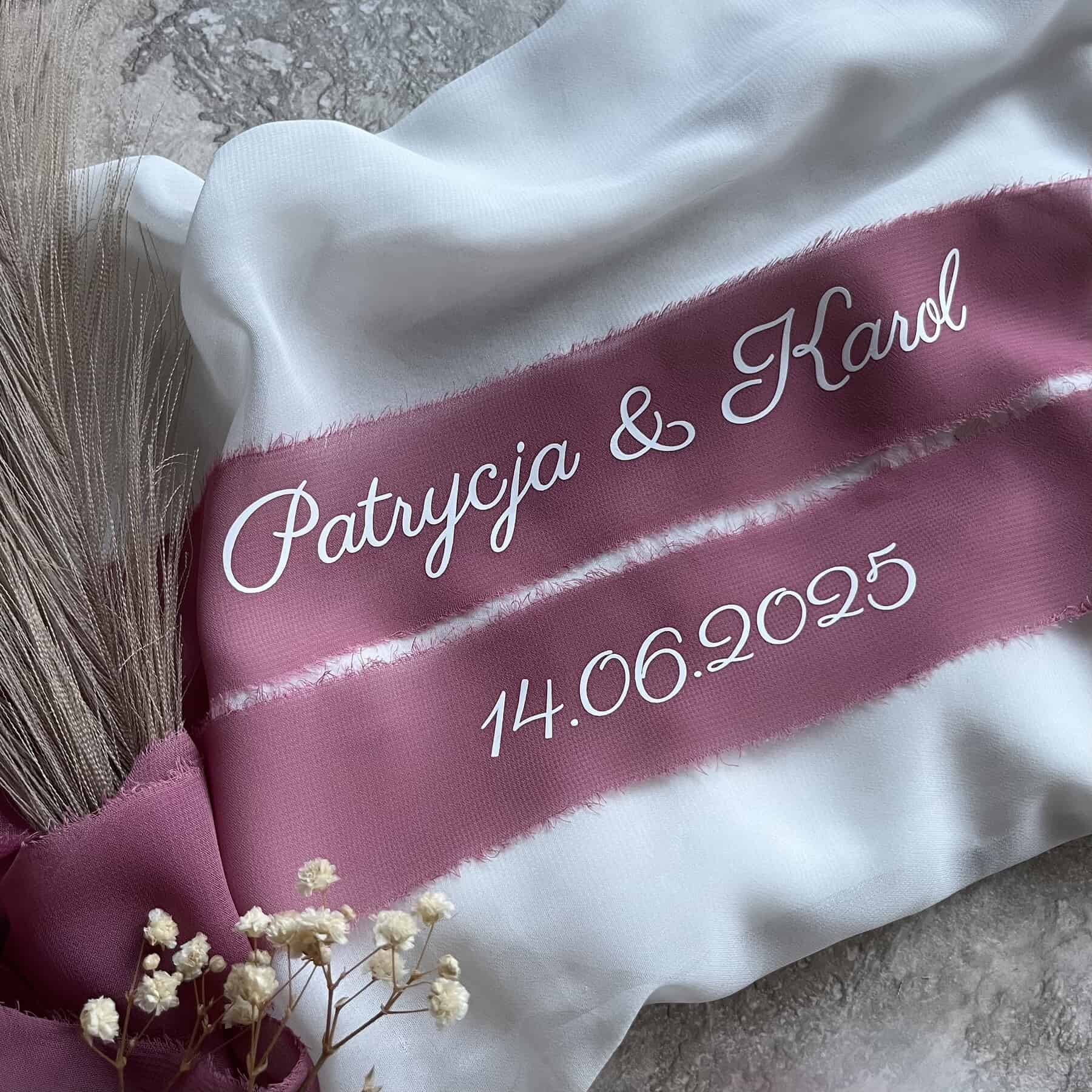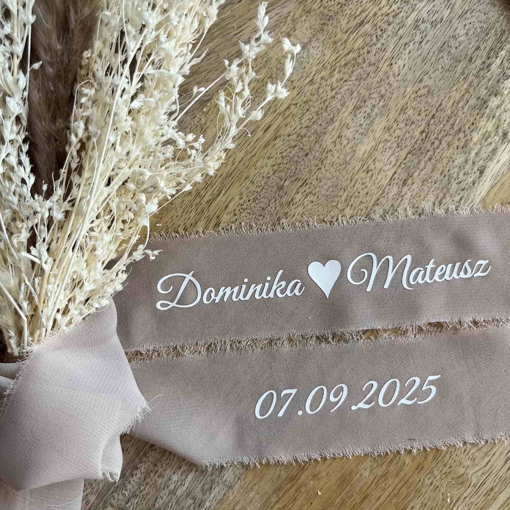 Personalizowana wstążka szyfonowa do bukietu ślubnego – Twój napis i data ślubu