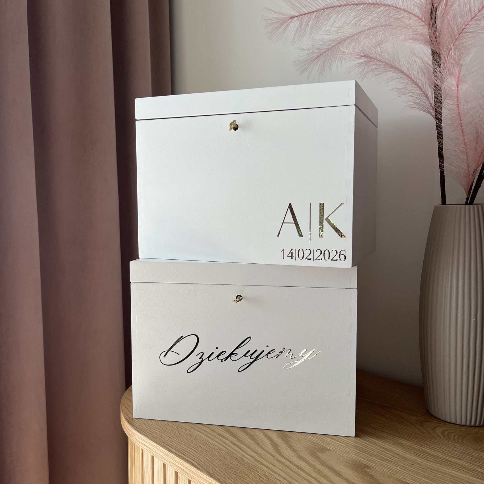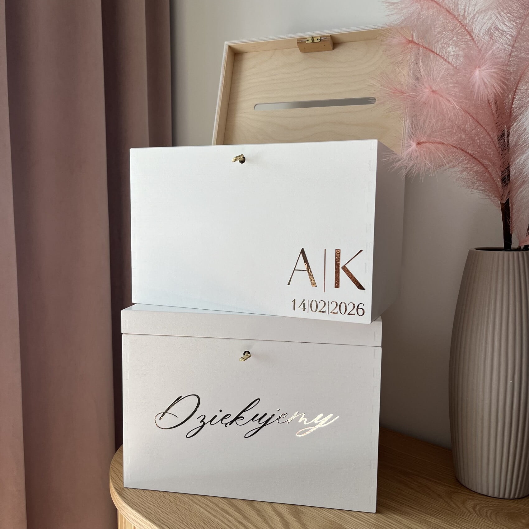 Nasza personalizowana skrzynka na koperty ślubne daje możliwość dopasowania do charakteru wesela. Na froncie może znaleźć się napis z imionami i datą ślubu, inicjałami i datą, a także uniwersalne „Dziękujemy”. Dzięki temu produkt staje się jeszcze bardziej osobisty i niepowtarzalny.