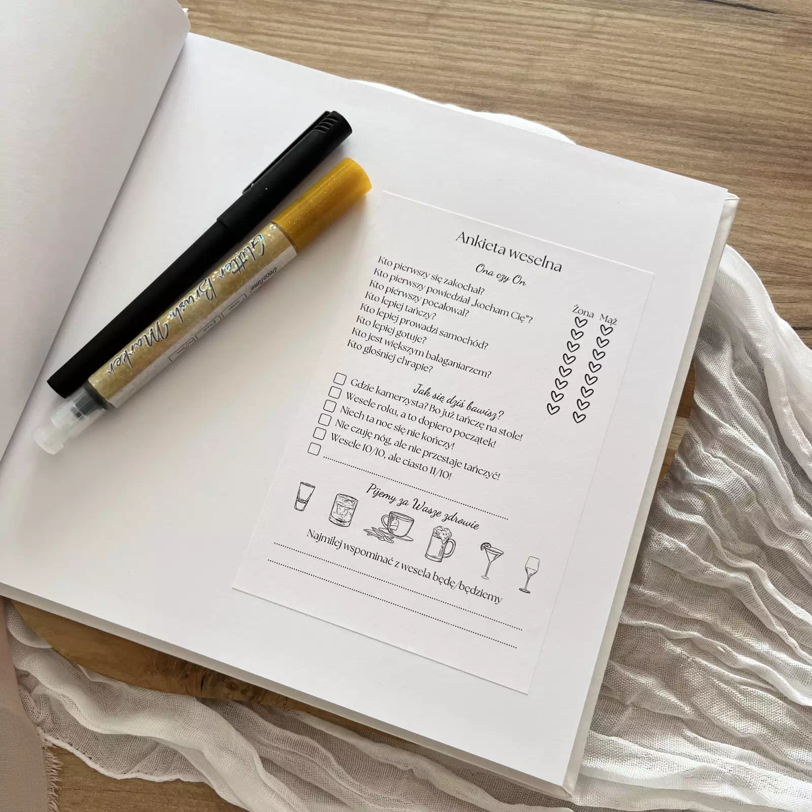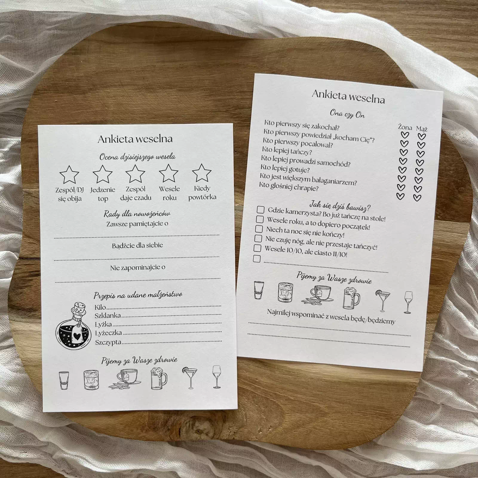 Dzięki tej formie ankiety weselne dla gości stają się czymś więcej niż tylko dodatkiem – tworzą interaktywną atrakcję, która integruje gości i zachęca do wspólnej zabawy. Matowy papier samoprzylepny gwarantuje łatwe użytkowanie oraz trwałość, dzięki czemu wszystkie odpowiedzi pozostają czytelne i estetyczne.