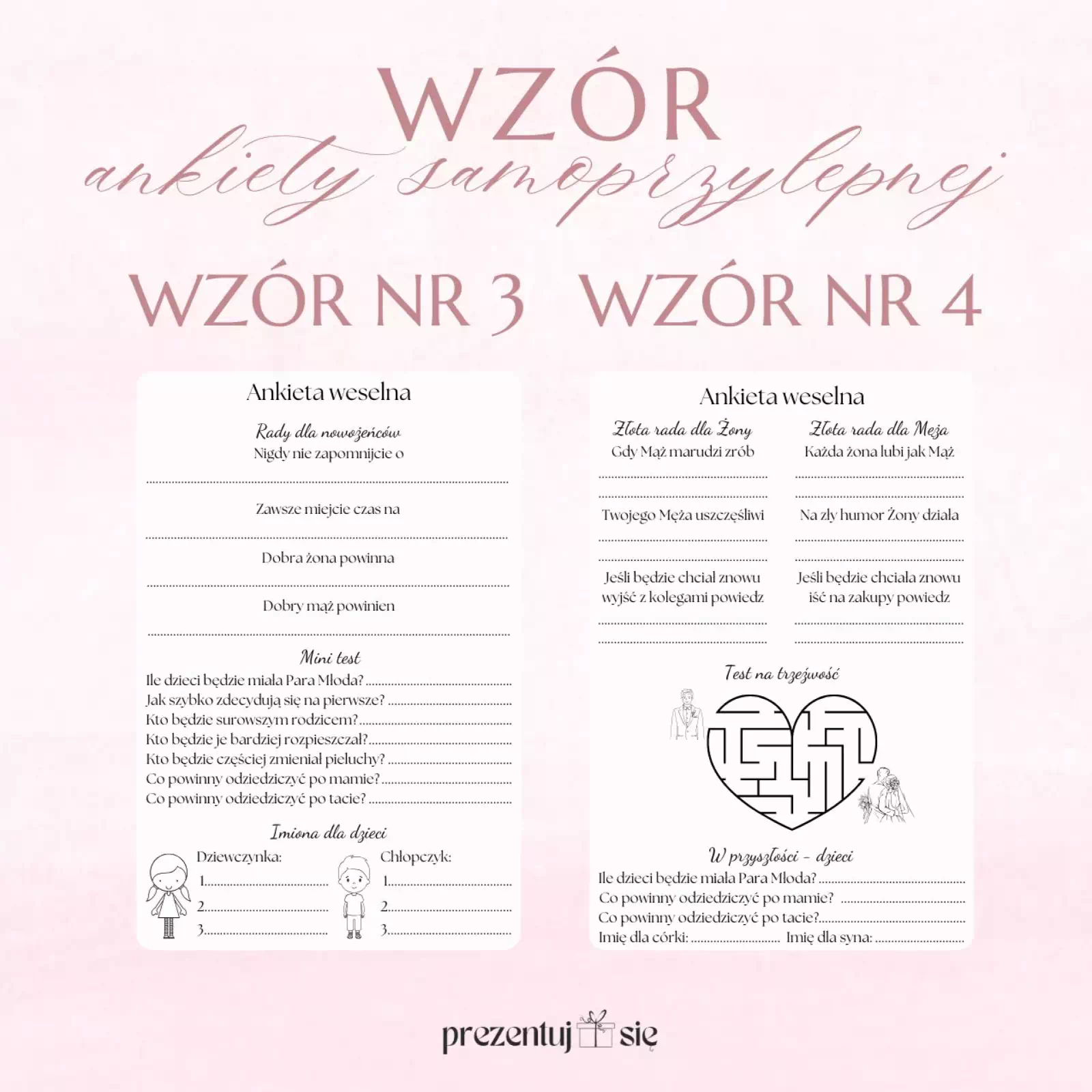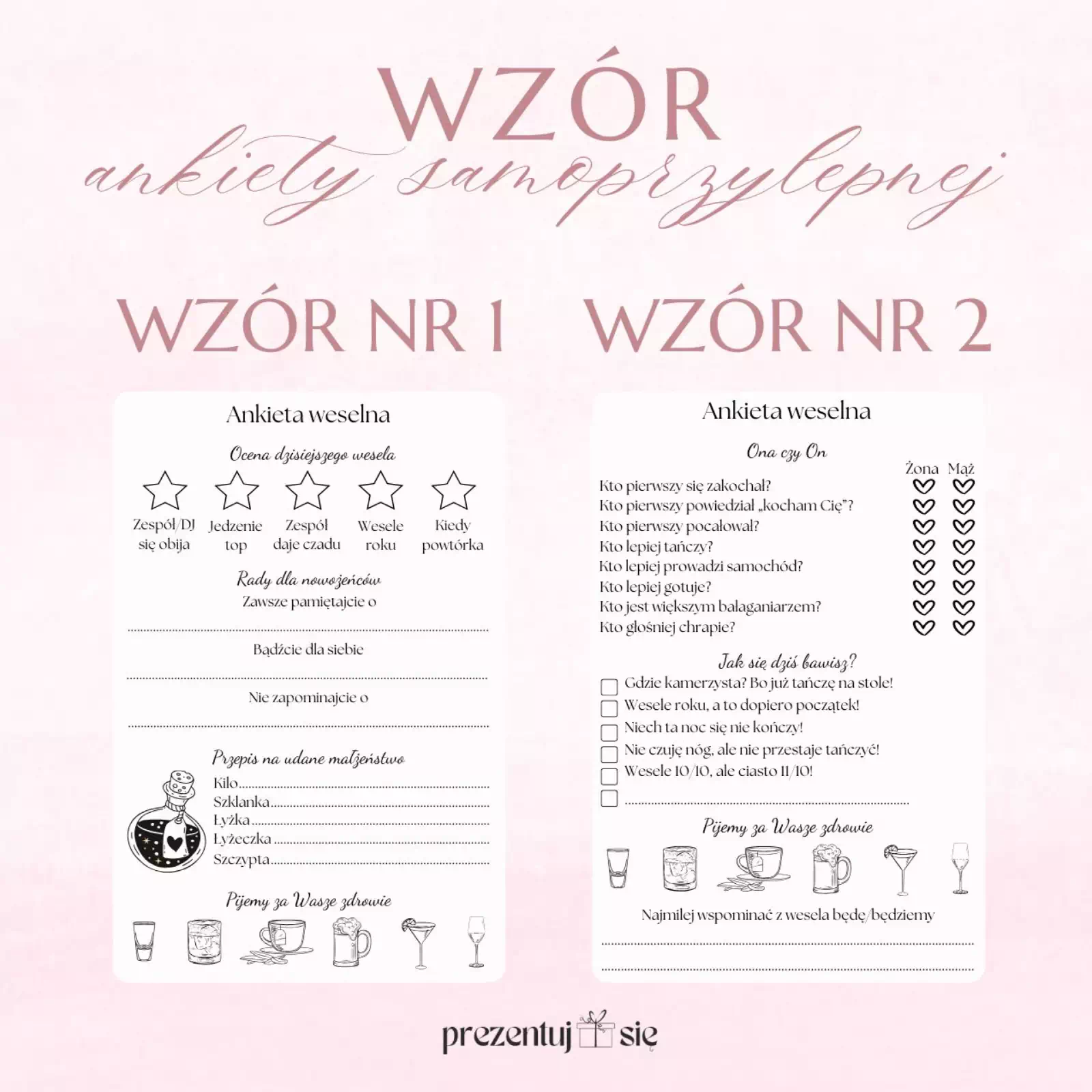 Nowoczesne Samoprzylepne ankiety na wesele to kreatywny sposób na zebranie wspomnień z dnia ślubu w estetycznej i uporządkowanej formie. Goście wypełniają gotowe pytania, a następnie przyklejają je do księgi gości tworząc wyjątkową kronikę pełną emocji, życzeń i zabawnych odpowiedzi. Dzięki temu ankieta na wesele staje się interaktywną atrakcją przyjęcia oraz piękną pamiątką na lata.