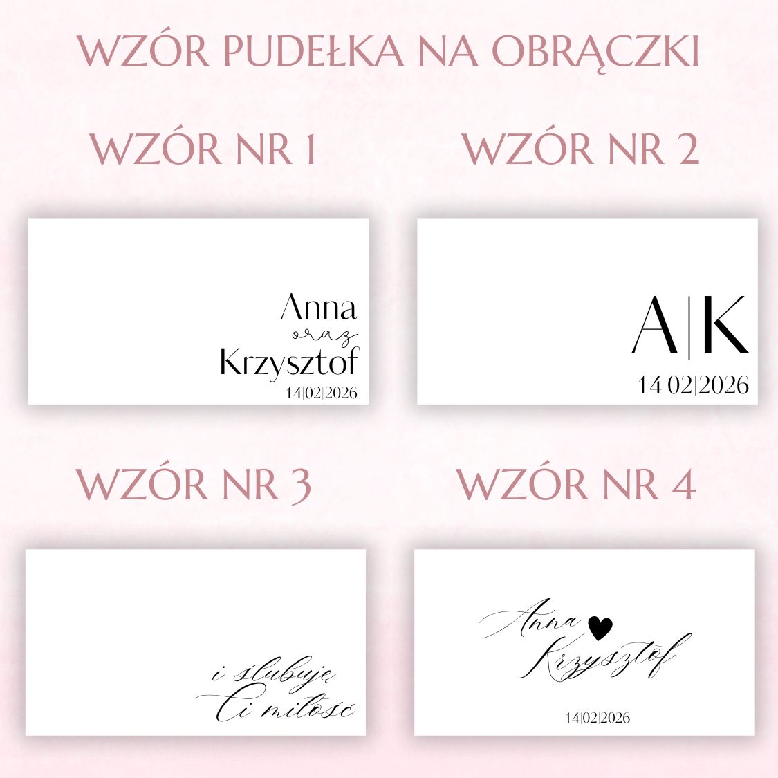 Nasze personalizowane pudełko na obrączki daje szerokie możliwości dopasowania do charakteru ślubu. Na wieczku można umieścić imiona pary młodej wraz z datą ślubu, inicjały lub uniwersalny napis „i ślubuję Ci miłość…”. Dodatkowo dostępne są różne kolory napisów, w tym złoty i srebrny lustrzany, co pozwala dopasować szkatułkę do motywu przewodniego uroczystości.