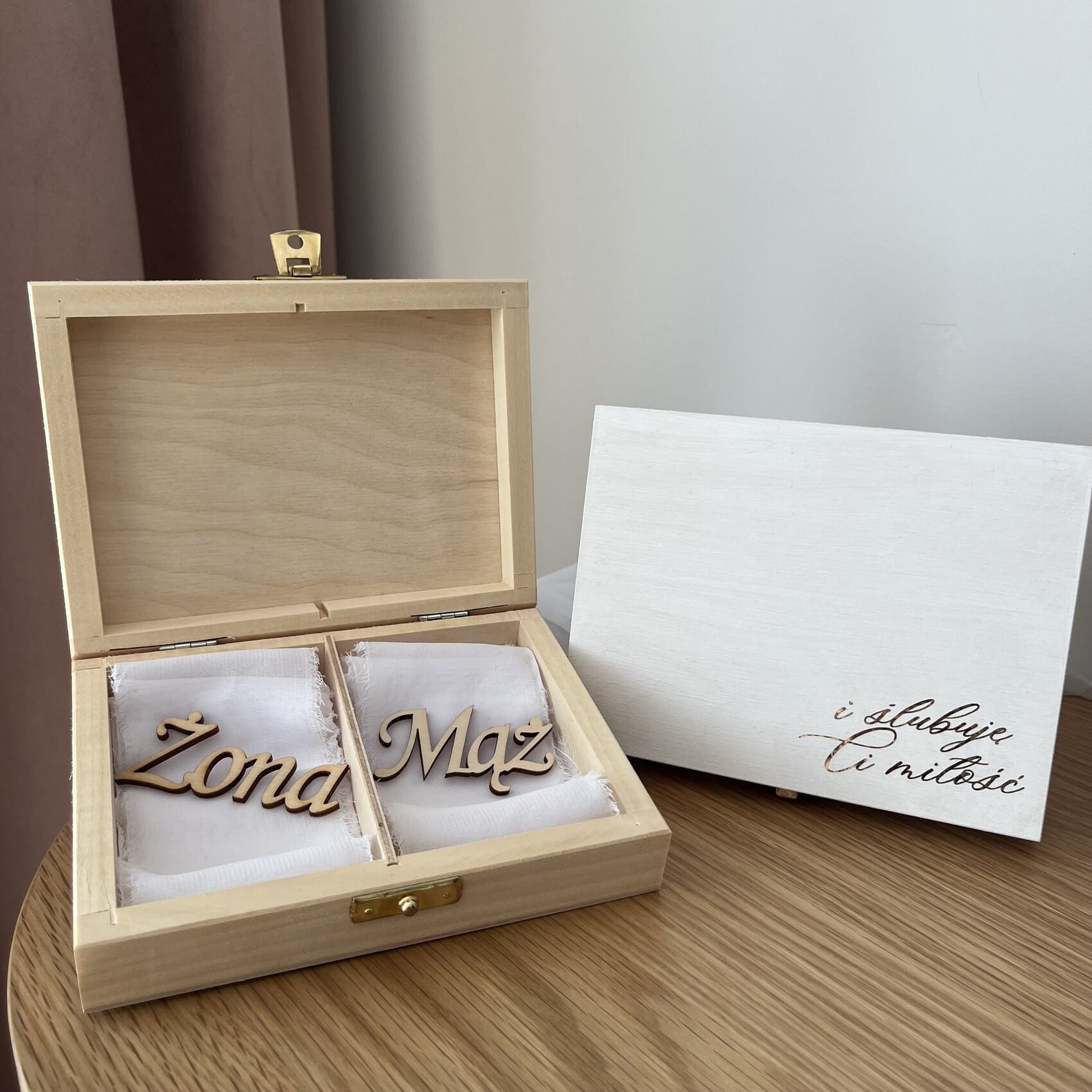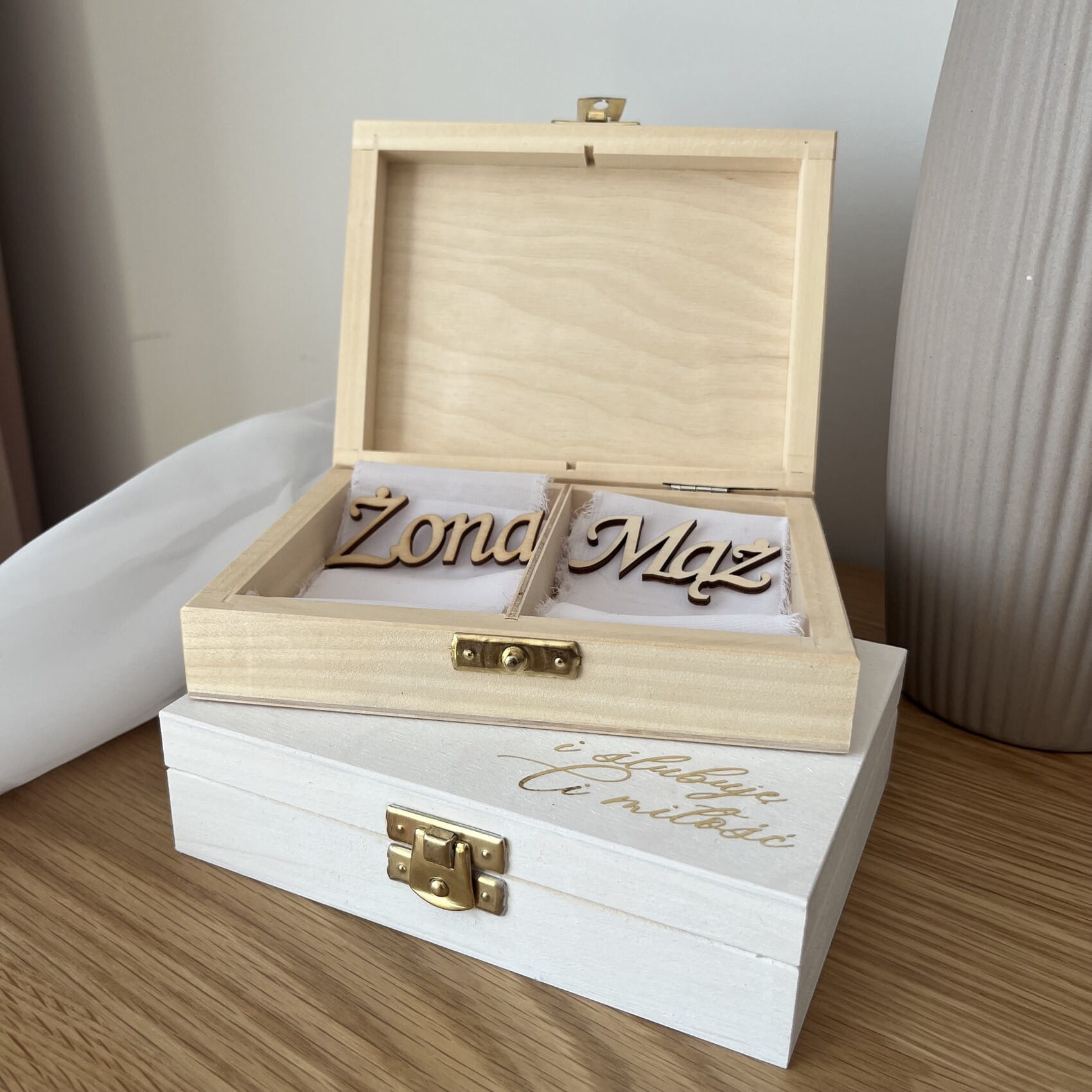 Nasze pudełko na obrączki ślubne to także świetny sposób, aby uczynić wymianę obrączek jeszcze bardziej wyjątkową i osobistą. Każdy detal, od gładkiej powierzchni drewna po starannie wykonane napisy, został przemyślany, aby sprostać oczekiwaniom pary młodej.