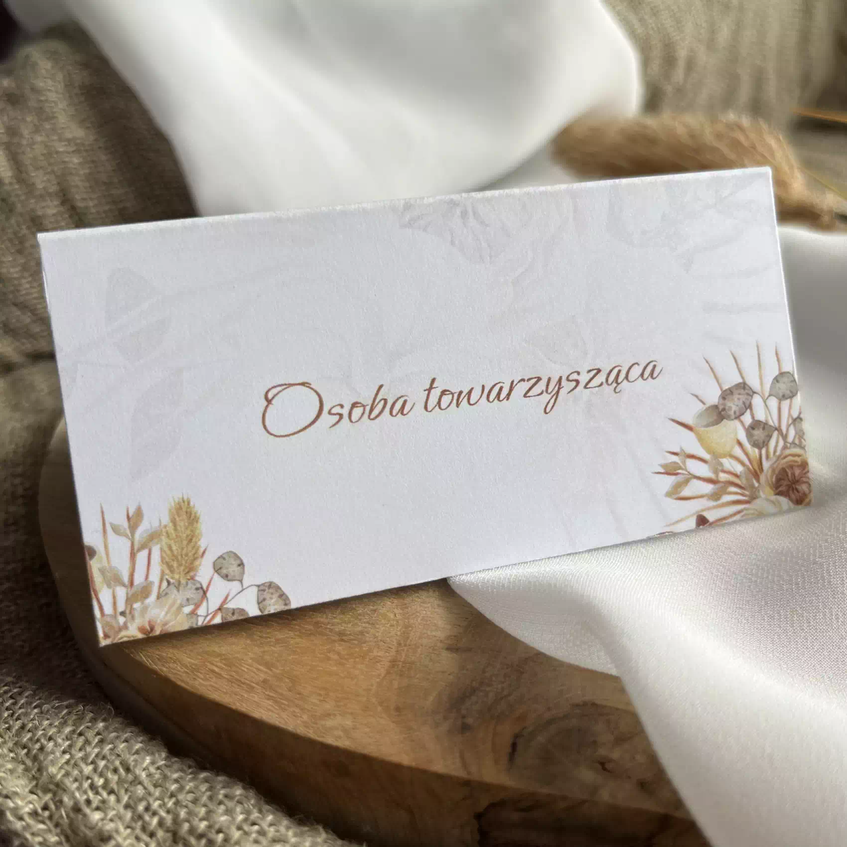 Motyw boho doskonale komponuje się z naturalnymi materiałami, suszonymi kwiatami oraz jasnymi tkaninami. Dzięki temu winietka weselna staje się integralną częścią aranżacji stołu, a nie jedynie dodatkiem. To uniwersalna winietka na wesele, która sprawdzi się zarówno podczas kameralnych uroczystości, jak i większych przyjęć.