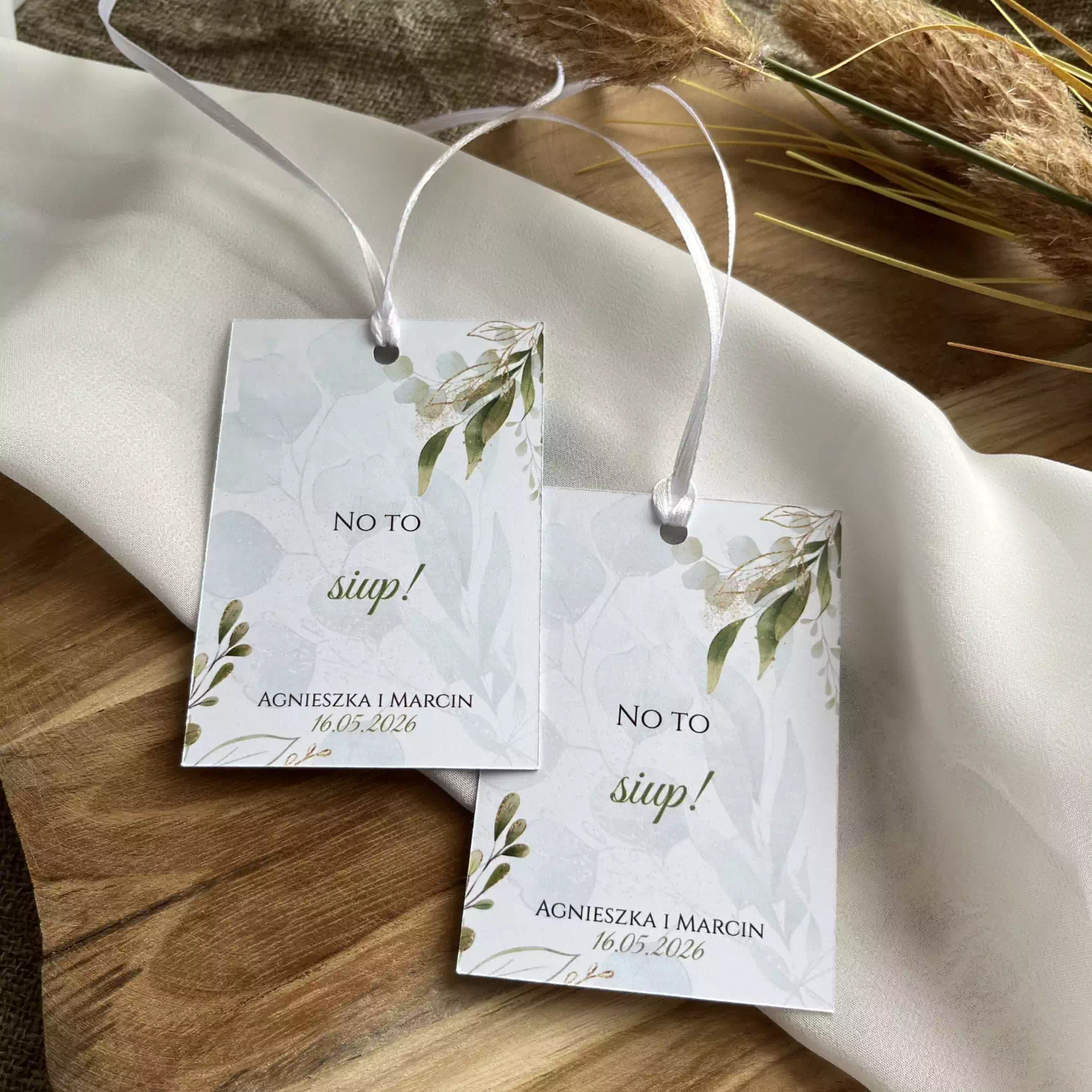 Zawieszki na alkohol wesele to nie tylko element dekoracyjny, ale także praktyczny dodatek, który wyróżnia przyjęcie i podkreśla dbałość o detale. Każda zawieszka gotowa do samodzielnego zawiązania wstążeczki pozwala na dopasowanie do wielkości butelek. Dodatkowo botaniczny motyw eukaliptusa dodaje elegancji i harmonii.